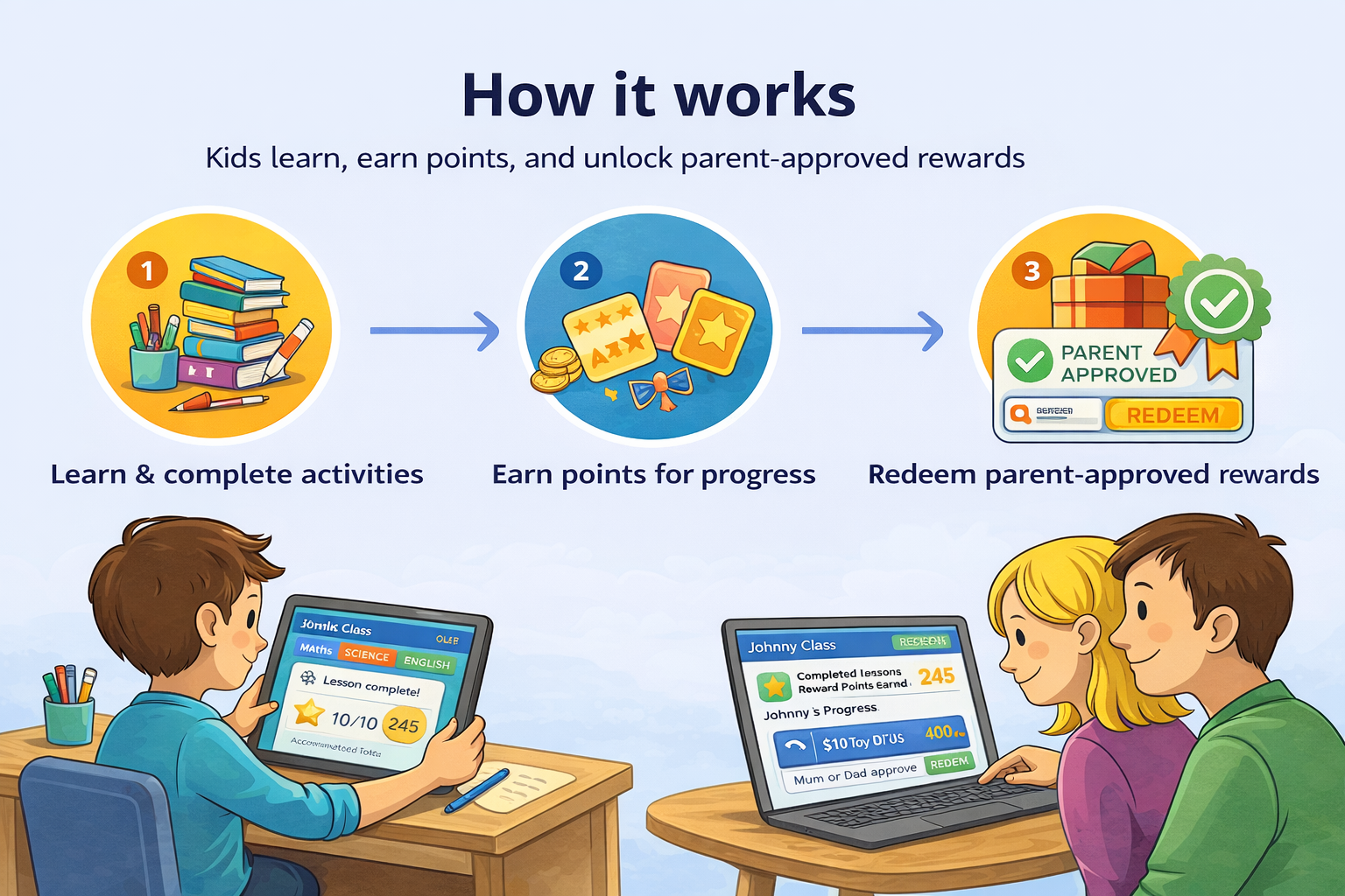 Children earn points by learning, making progress, and finishing activities.3. Unlock parent-approved rewards